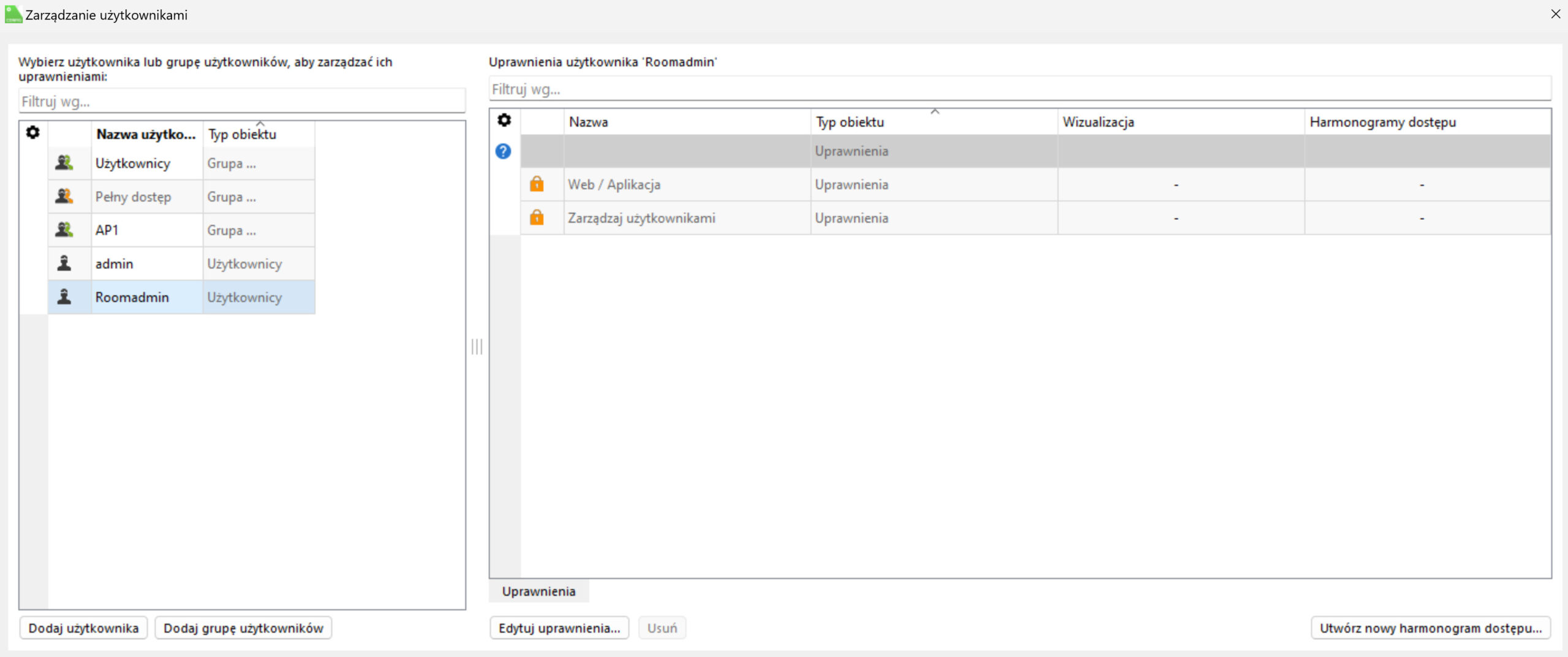2. Stworzenie użytkownika z prawem do Web/Aplikacja oraz do zarządzania użytkownikami (np. Roomadmin)