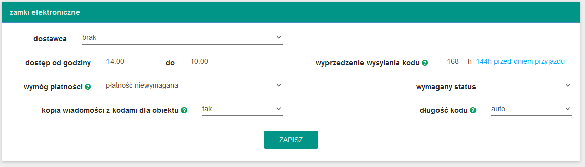 · czas wysłania kodu zamka – w polu >wyprzedzenie wysyłania kodu – wpisujemy ilość godzin – na ile godzin przed 23:59 w dniu przyjazdu wysłać kod zamka