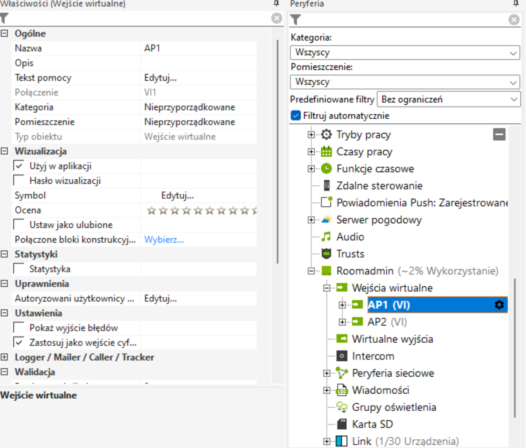 1. Dla każdego apartamentu należy utworzyć wejście wirtualne (np. AP1, AP2, itp.), które będzie aktywowane/dezaktywowane poprzez Roomadmin. Wejście wirtualne nie powinno mieć zaznaczonej opcji Hasło wizualizacji!