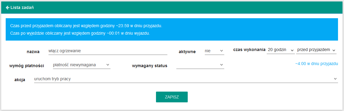 Czas wykonania zadania określamy przez wybór parametrów na dwóch listach – pod polem czas wykonania i obok tego pola. W celu aktywacji zadania na liście pod polem czas wykonania ustawiamy standardowo >przed przyjazdem. Następnie na liście obok tego pola ustawiamy, z jakim wyprzedzeniem zadanie ma nastąpić. Aktywacja obliczana jest względem godziny 23:59 w dniu przyjazdu. Wyprzedzenie można ustawić z dokładnością do godziny lub liczonym w dniach. Np. jeśli ustawimy 10 godzin – zadanie rozpocznie się ok. 14 w dniu przyjazdu