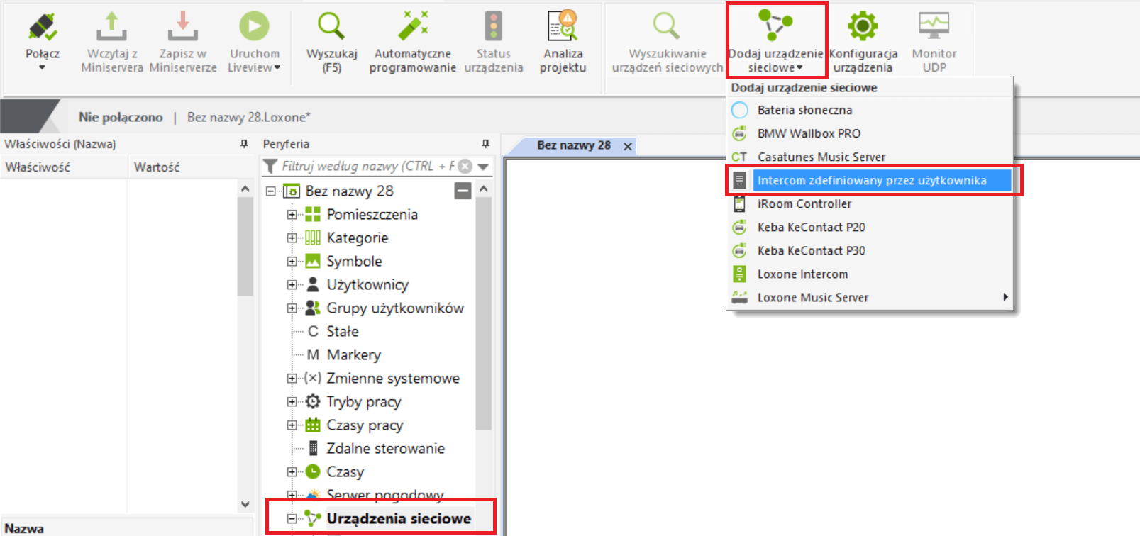 Pierwszą rzeczą do zrobienia jest stworzenie urządzenia sieciowego. Jeśli używasz Loxone Intercom / Intercom XL, wybierz „Loxone Intercom”. Jeśli używasz innej kamery lub domofonu, wybierz „Intercom zdefiniowany przez użytkownika”.