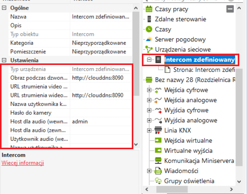 | Strumień wideo URL (wewnętrzny) | http: // „zewnętrzny adres IP modułu wideo: port” (np. clouddns: PORT, jeśli zewnętrzny adres miniserwera i kamery są takie same) |