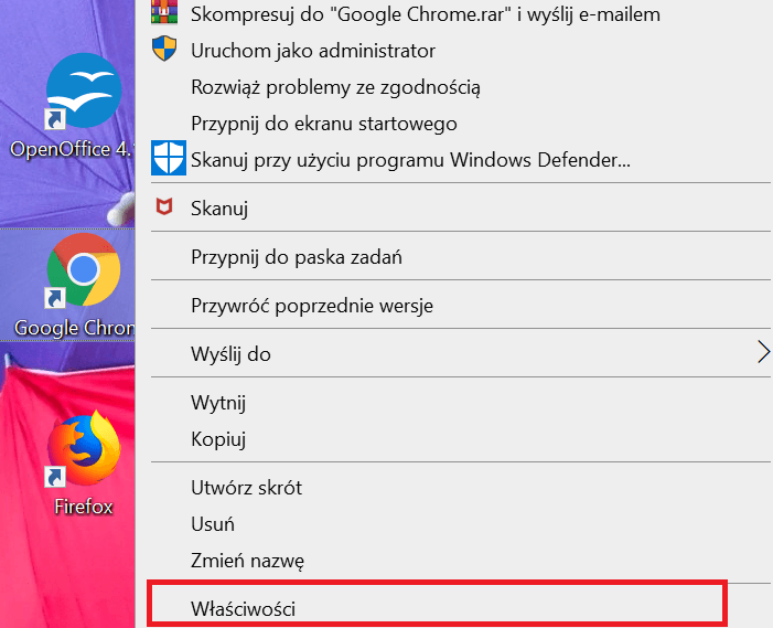 Aby to zrobić, kliknij prawym przyciskiem myszy ikonę Google Chrome i otwórz właściwości.