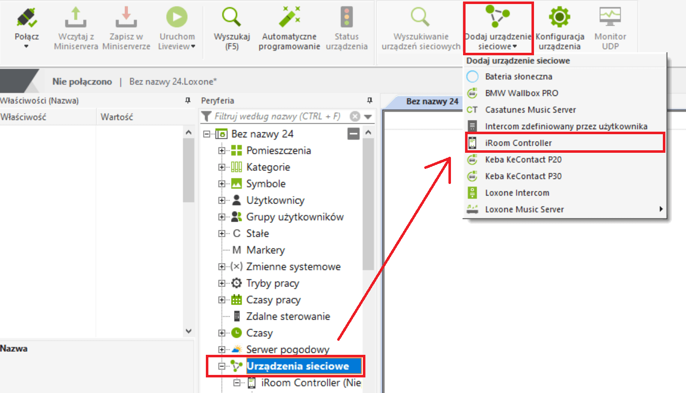 Aby wstawić kontroler iRoom, najpierw wybierz wiersz „Urządzenia sieciowe” w drzewie urządzeń peryferyjnych. Następnie w prawym górnym rogu pojawi się przycisk „Dodaj urządzenie sieciowe”. Kliknięcie tego przycisku powoduje otwarcie menu rozwijanego. Następnie należy kliknąć w linijkę iRoom Controller.