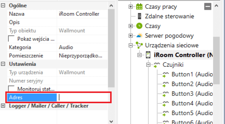 Możesz teraz wprowadzić adres sieciowy we właściwościach kontrolera iRoom.
