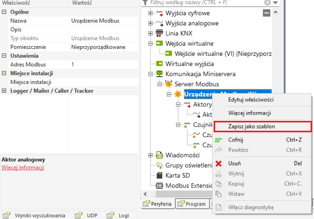 Aby to zrobić, kliknij prawym przyciskiem myszy urządzenie Modbus w drzewie urządzeń peryferyjnych, a następnie „Zapisz jako szablon”. Upewnij się, że nazwa pliku zaczyna się od „MB_”!