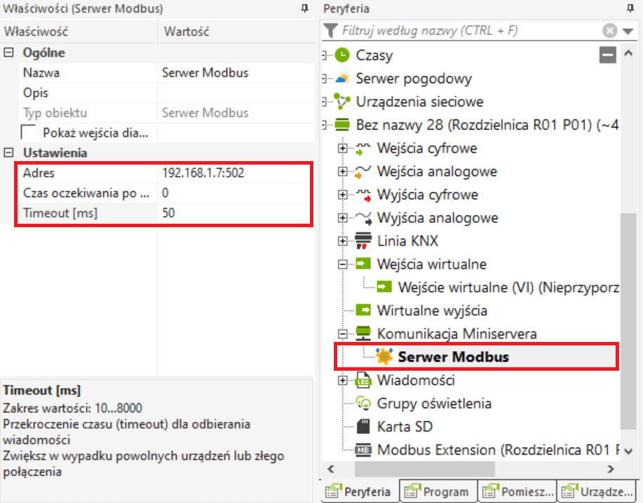 Adres IP urządzenia Modbus, czas oczekiwania po ponownym uruchomieniu miniservera i limit czasu muszą być ustawione we właściwościach serwera Modbus. W zależności od tego, jak szybko lub wolno zachowuje się urządzenie Modbus, należy dostosować limit czasu.