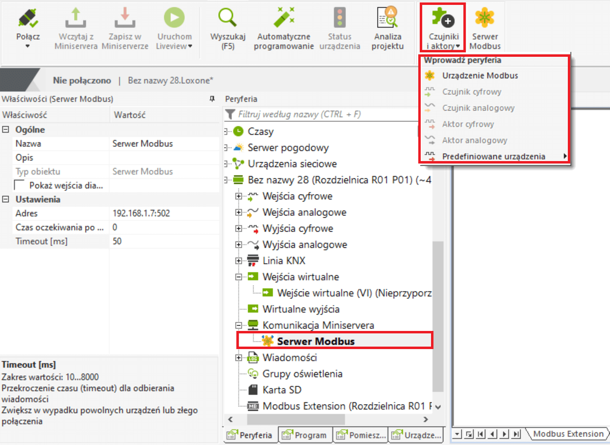 Aby wstawić nowe urządzenie Modbus, najpierw zaznacz serwer Modbus w drzewie urządzeń peryferyjnych. Teraz w prawym górnym rogu znajduje się punkt menu Czujniki i aktory, w którym można również wybrać urządzenie Modbus.