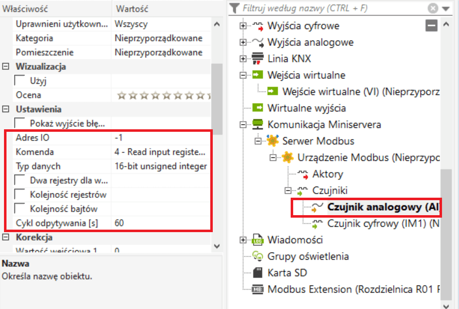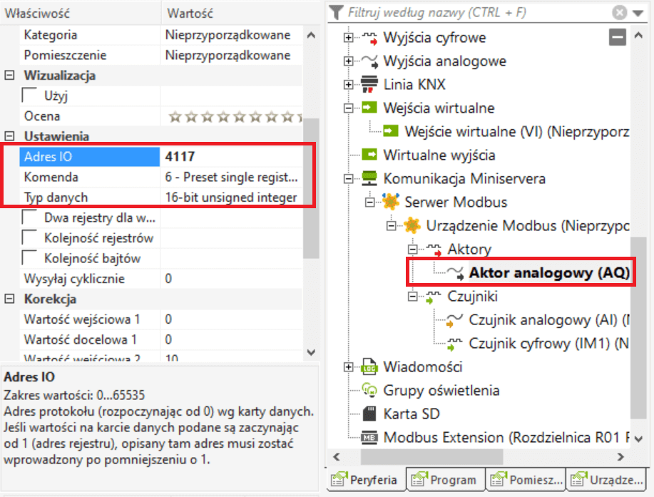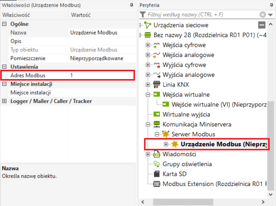 Adres klienta lub węzła Modbus należy teraz określić we właściwościach urządzenia.