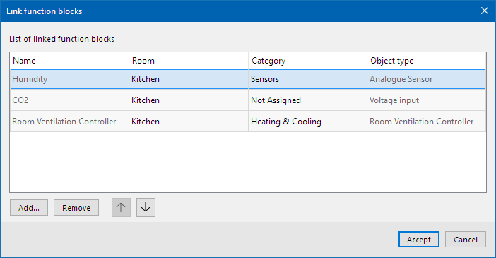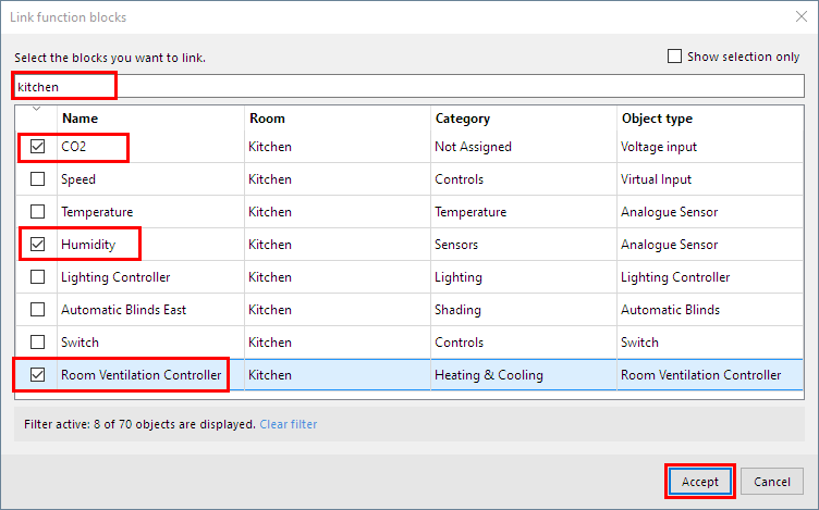 W poniższym przykładzie łączymy inteligentny regulator pomieszczeniowy w kuchni z dodatkowymi obiektami.