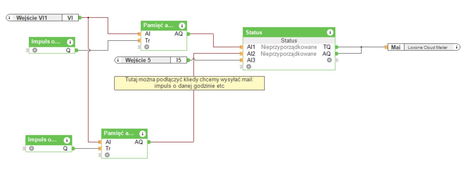 W tym projekcie przyjęliśmy, że kontrola temperatury ma być rejestrowana 2 razy dziennie, a mail będzie wysyłany przy zmianie dnia (z dwoma wartościami z dnia poprzedniego). Blok status gromadzi w sobie dwie zmienne podawane na wejścia analogowe AI1 oraz AI2. Bloki impuls o czasie wysyłają aktualną wartość poprzez blok pamięć analogowa. Ten projekt można rozbudować o walidację w przedziale 2-8 stopni tak, aby po przekroczeniu odpowiedzialna osoba została szybko powiadomiona. Najprościej zaznaczyć walidację w właściwościach, oraz wyciągnąć wyjście błędu na kartę programowania.