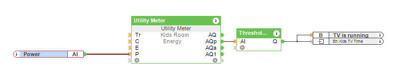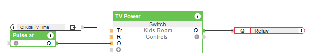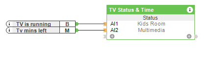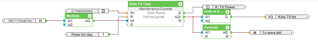 Pierwszym krokiem jest sprawdzenie, czy moc w Smart Socket przekracza pewną wartość, u nas jest to 30 W. Jeśli zmierzona wartość jest wyższa, impuls jest wysyłany do licznika co minutę. Ten licznik wyłącza przekaźnik Smart Socket przez wyjście Q. 5 minut przed upływem czasu do strefy audio w pokoju dziecięcym wysyłana jest wiadomość tekstowa o treści: „Proszę wyłączyć telewizor, w przeciwnym razie wyłączy się automatycznie za 5 minut”, patrz moduł Status. Możesz ustawić maksymalny czas oglądania telewizji za pomocą wirtualnego wejścia „Czas telewizji” i sprawdzać wyczerpany limit za pomocą wirtualnego statusu „Dzisiejszy czas telewizji”.