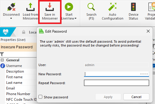 Po zakończeniu wstępnej konfiguracji należy zapisać dane w urządzeniu Miniserver i zmienić domyślne hasło.