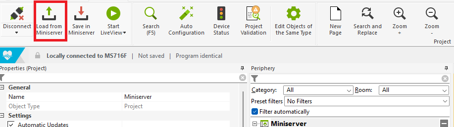 - Zaleca się, aby przed wprowadzeniem zmian zawsze załadować bieżący projekt, w tym wszelkie zmiany wprowadzone przez użytkownika, z Miniservera do Loxone Config. Aby to zrobić, kliknij „Wczytaj z Miniservera”.