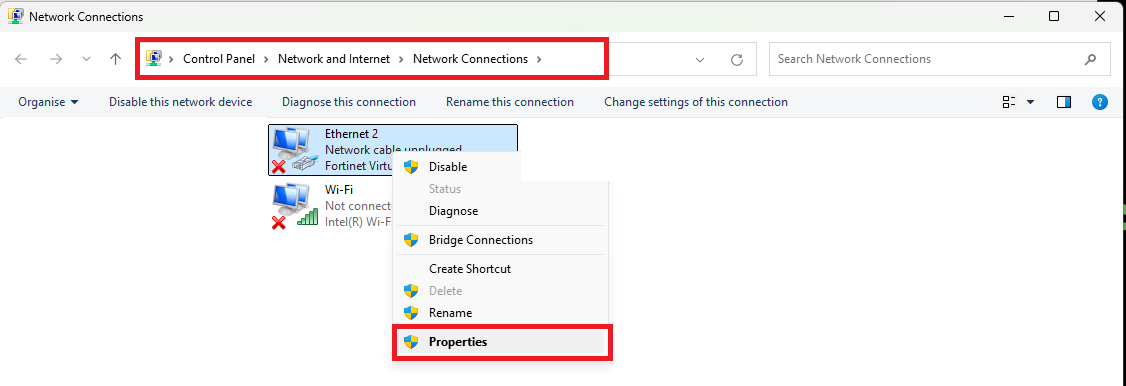 Następnie przejdź do właściwości połączenia Ethernet lub LAN: