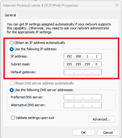 4. Wprowadź prawidłowy adres IP urządzenia Miniserver spoza zakresu DHCP routera. Dodaj maskę podsieci, bramę (zwykle jest to adres IP routera/modemu) i adresy serwerów DNS. (Adresy serwerów DNS można uzyskać od dostawcy usług internetowych lub skorzystać z publicznych alternatyw).
