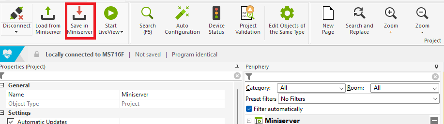 - Po wprowadzeniu zmian można je zapisać w programie Miniserver. Wystarczy kliknąć przycisk „Zapisz w Miniserverze”, a lokalne zmiany wprowadzone w oprogramowaniu zostaną przesłane do Miniservera, który automatycznie uruchomi się ponownie w celu załadowania zmian. Po ponownym uruchomieniu Miniserver będzie działać ze zaktualizowaną konfiguracją.