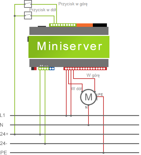 Podłączenie żaluzji Knowledge Base Okablowanie Podłączenie żaluzji Przykład podłączenia silnika żaluzjowego i przycisków w górę i w dół.