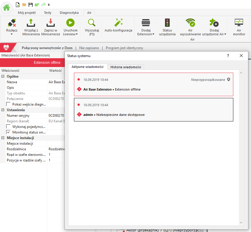 Status systemu jest dostępny zarówno w konfiguracji Loxone, jak i w aplikacji Loxone Smart Home.