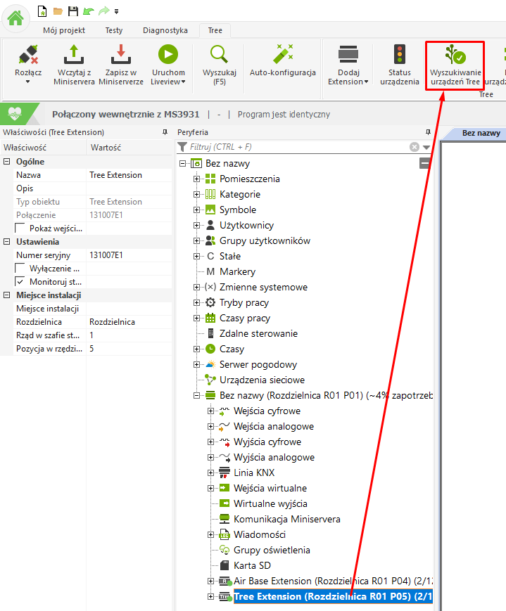 W pierwszej kolejności podłącz urządzenie Tree do Tree Extension. Następnie wyszukaj je w Configu i naucz. Uczenie można rozpocząć poprzez zaznaczenie Tree Extension i wybranie wyszukiwania urządzeń Tree w górnym menu.