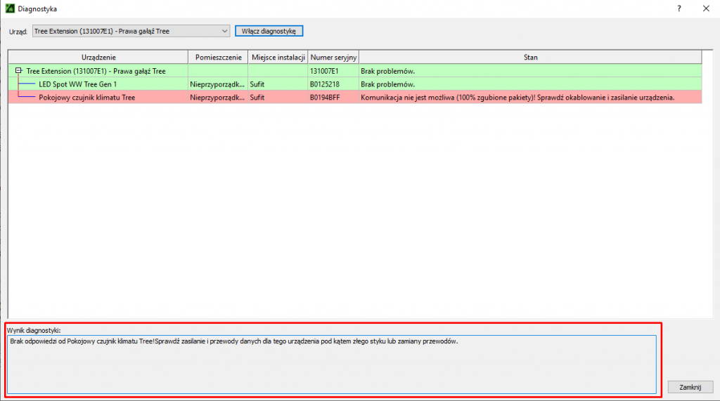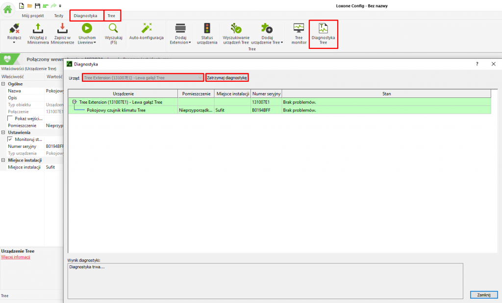 Obie gałęzie Tree możesz sprawdzić za pomocą przycisku „Diagnostyka”. Dzięki tej funkcji możesz na przykład zidentyfikować usterkę w okablowaniu i szybko rozwiązać problem.
