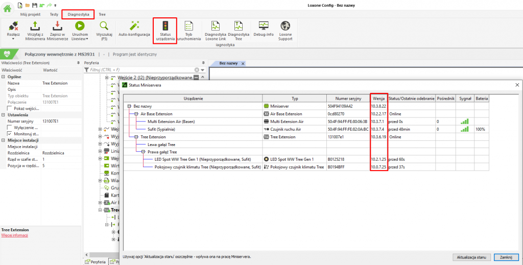 Wersje oprogramowania poszczególnych urządzeń można sprawdzić w oknie „Status urządzenia”. Jeśli numer znajduje się na zielonym tle, urządzenie jest aktualne. Jeśli numer znajduje się na czerwonym tle, musisz zaktualizować urządzenie.