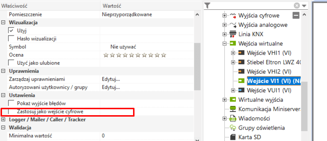 Wirtualne wejścia mogą być używane zarówno jako wejścia cyfrowe, jak i analogowe. Typ wyboru ustawiasz w oknie właściwości.