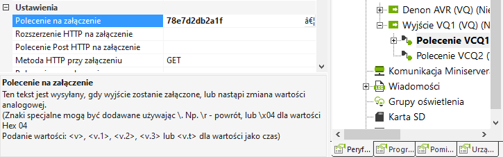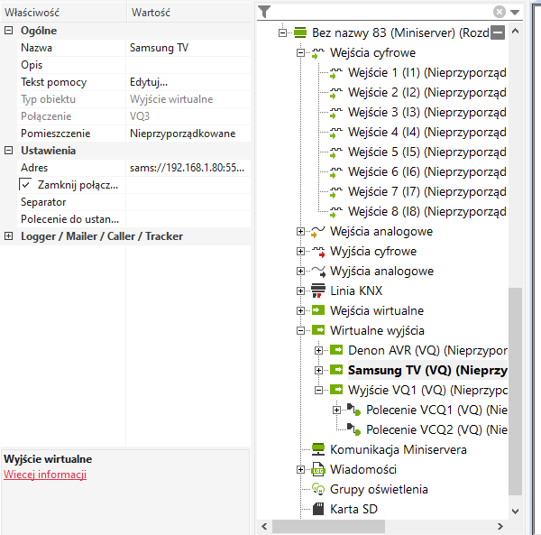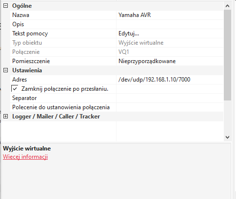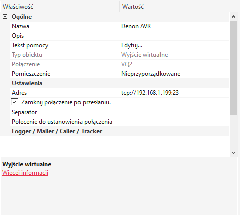 Protokół, adres i port sterowanego urządzenia wpisuje się we właściwościach wirtualnego wyjścia. W przypadku http, tcp i wol protokół należy wprowadzić przed adresem (np. tcp: //192.168.1.199: 23):
