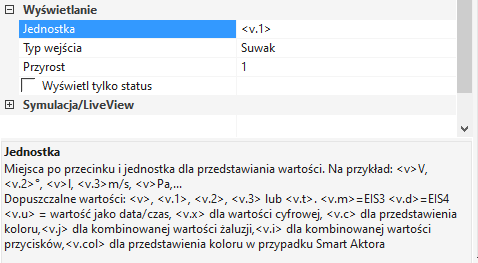 W pozycji Wyświetlanie można wprowadzić żądane miejsca dziesiętne, typ danych wejściowych i jednostkę dla przedstawienia i określenia wartości. Zawsze zwracaj uwagę na okno pomocy, jak pokazano na rysunku: