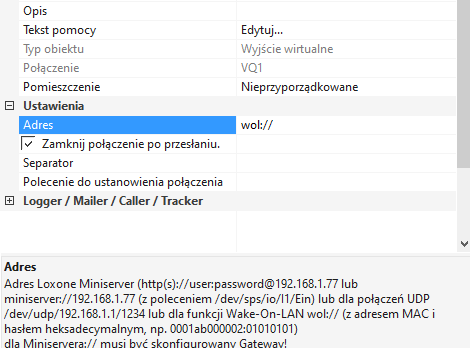 Wirtualne złącze wyjściowe służy do sterowania urządzeniami obsługującymi sieć. Sterowane urządzenie powinno mieć możliwość korzystania z protokołu zgodnego z Miniserverem (tcp, udp, http, wol).