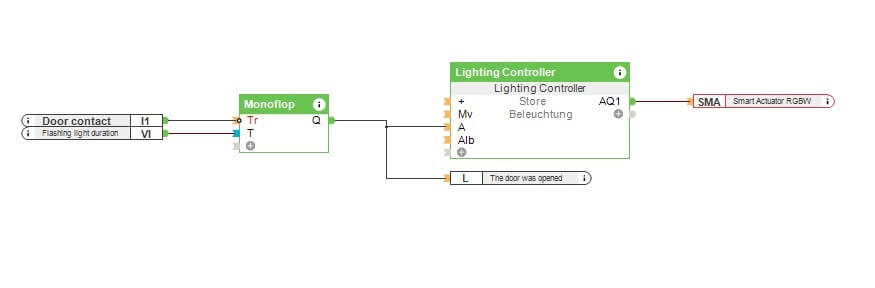 Kiedy drzwi się otworzą, światło w wyznaczonych pomieszczeniach zacznie migać. Czas może być ustawiony za pomocą bloku Monoflop, parametr T. Jasność światła może być ustawiona parametrem Ba w bloku sterownik oświetlenia a okres alarmu może być ustawiony za pomocą parametru Ta. Jeżeli Ta=2 oznacza to że światło włączy się na sekundę i wyłączy na sekundę.