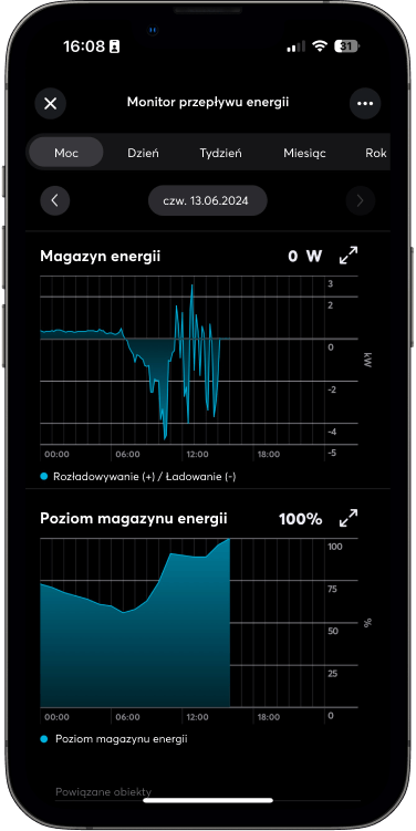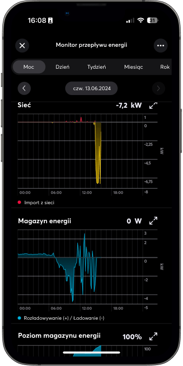 System samodzielnie decyduje, kiedy naładować lub rozładować akumulator w zależności od poziomu produkcji energii, aktualnego zużycia w budynku i cen energii elektrycznej SPOT (jeśli korzystasz z taryf dynamicznych). To dodatkowo zwiększa wydajność i zmniejsza zależność od sieci.