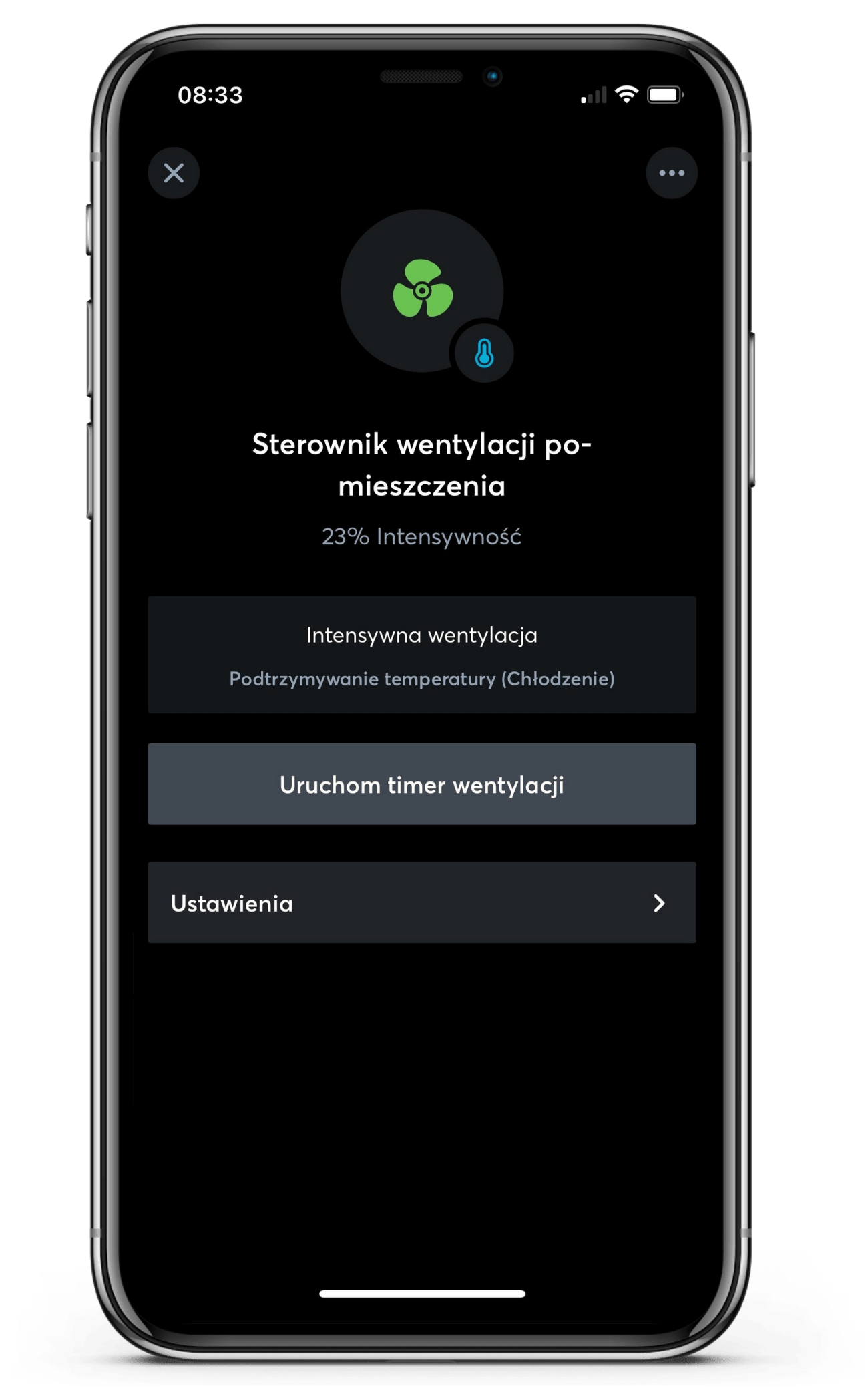 Jeśli potrzebujesz całkowitej ciszy, a hałas wentylacji mi przeszkadza, możesz ją łatwo wyłączyć za pomocą aplikacji.