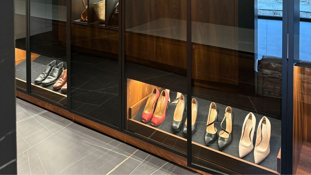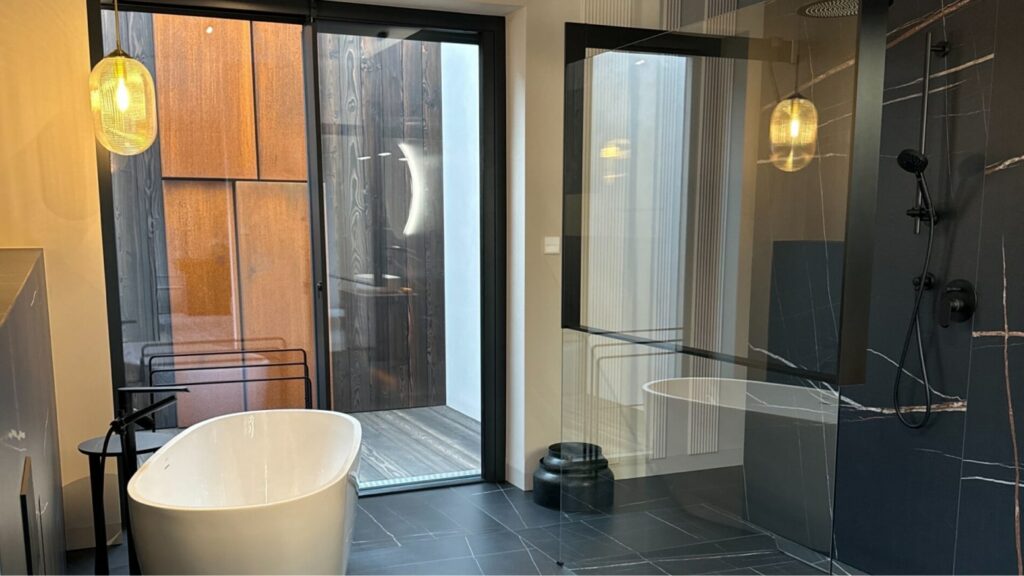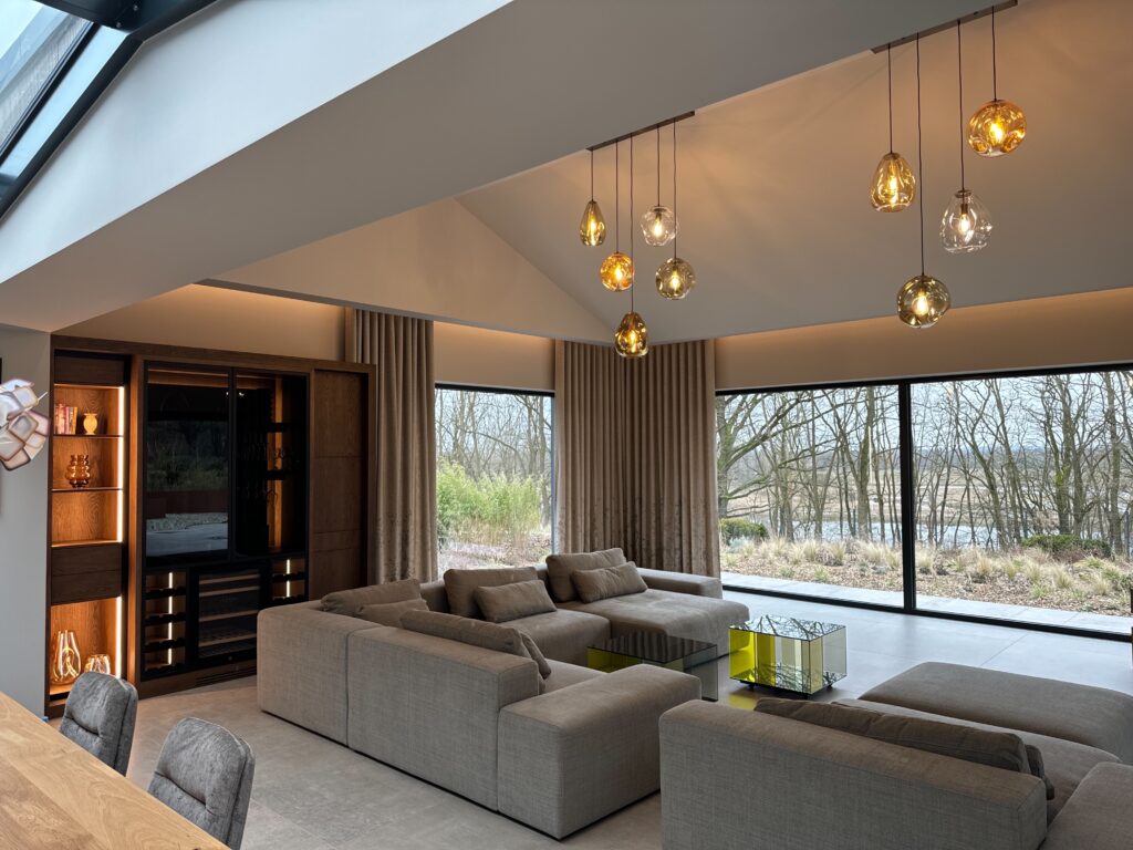 Access is via app or NFC code touch, supplemented by a fingerprint reader at the house entrance. DALI-controlled lighting provides individually customizable lighting moods, while RGBW accents and a multi-room audio system ensure the perfect ambience.