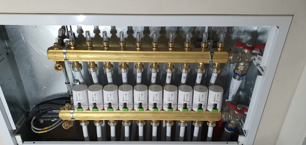 Przewody z kontaktronów okiennych zostały skierowane do Miniservera. Do wysterowania obwodów taśm LED użyliśmy lokalnie RGBW 24V Dimmer Tree. System grzewczy w domu oparty jest na kotle gazowym oraz na kominku z płaszczem wodnym zasilającym podłogówkę. Został opomiarowany czujnikami 1-Wire a pompy wysterowane przekaźnikami z rozdzielnicy głównej. W rozdzielaczach znalazły się siłowniki Tree.