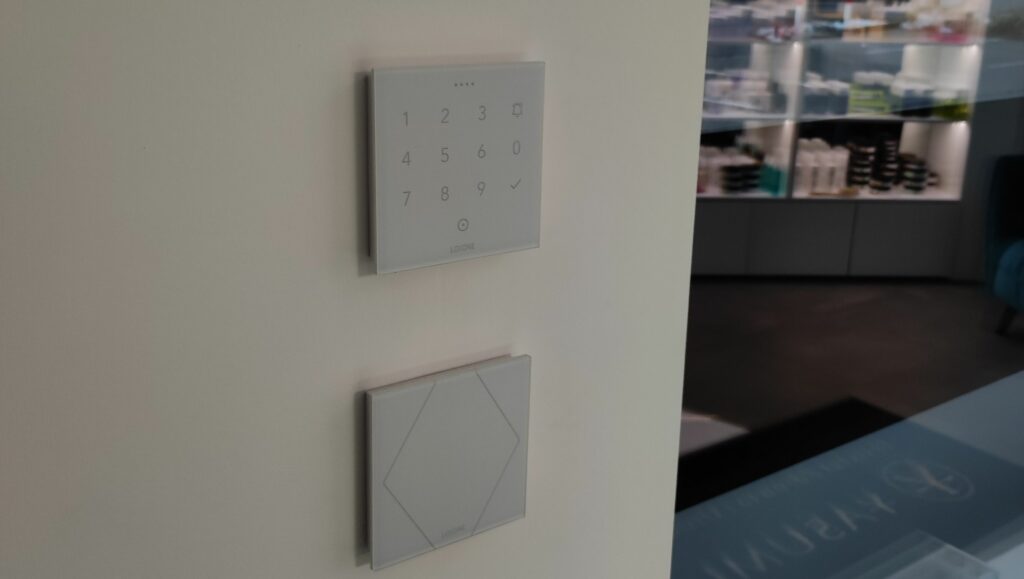 System Loxone pełni w lokalu również funkcje alarmowe. Każdy pracownik jest niezależnie identyfikowany przypisanym do niego breloczkiem oraz kodem dostępu, który przy wykorzystaniu NFC Code Touch umożliwia rozbrojenie alarmu.