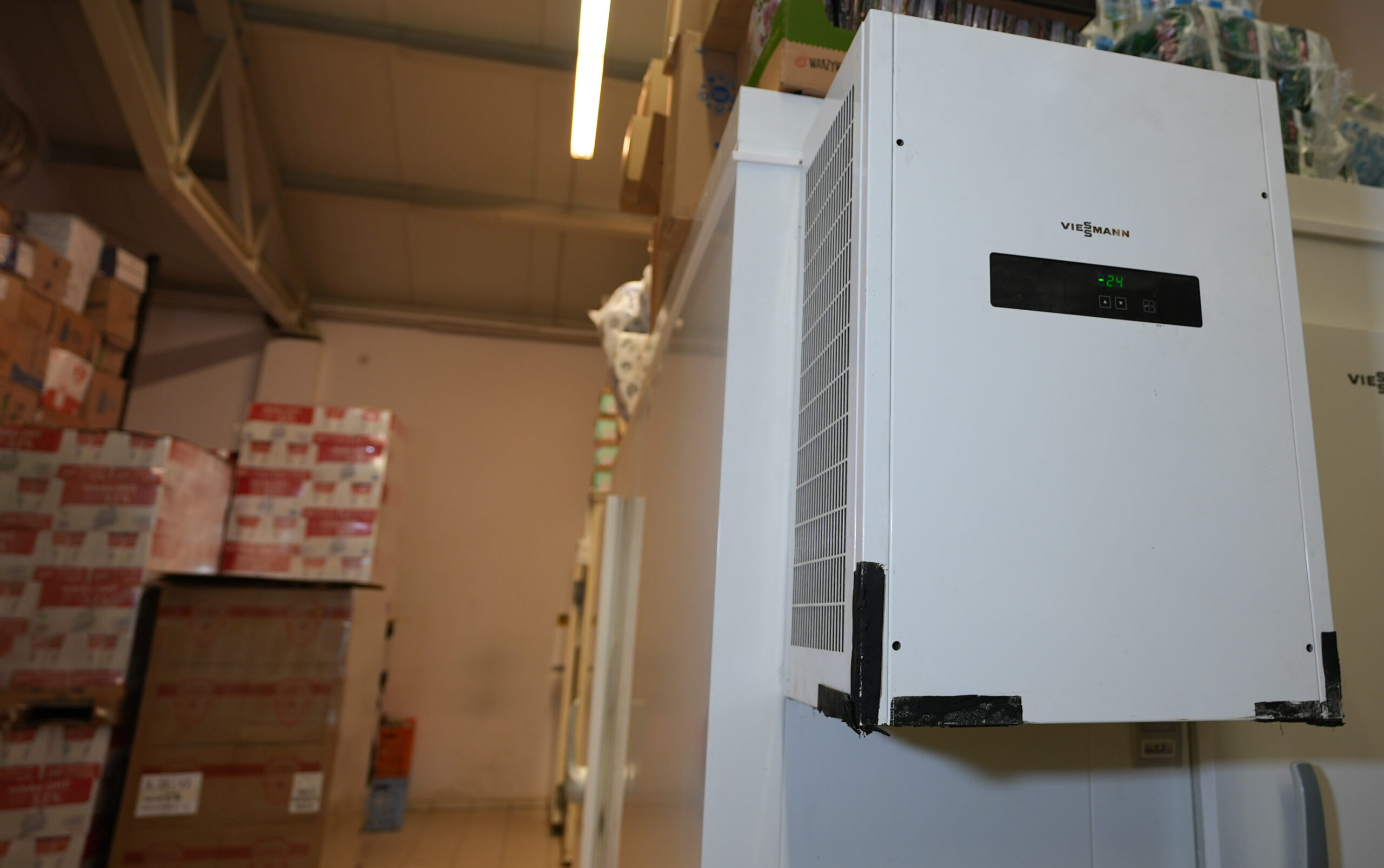 V chladiarni a mraziarni je výmenník tepla, ktorý v zime privádza teplo do predajne a v lete odvádza prebytočné teplo von. V lete je v prevádzke aj ventilátor na odsávanie vzduchu, ktorý udržuje správnu vnútornú klímu a zaisťuje príjemné podmienky pre nakupovanie. Kúrenie pracuje v dvoch režimoch – výmena vzduchu alebo vykurovanie – a je možné ho ľahko nastaviť podľa potreby. Do systému je integrovaná aj vzduchová clona s cirkuláciou vody, ktorá funguje pri vstupe do predajne. Pre clonu je možné nastaviť rýchlosť vypúšťania.