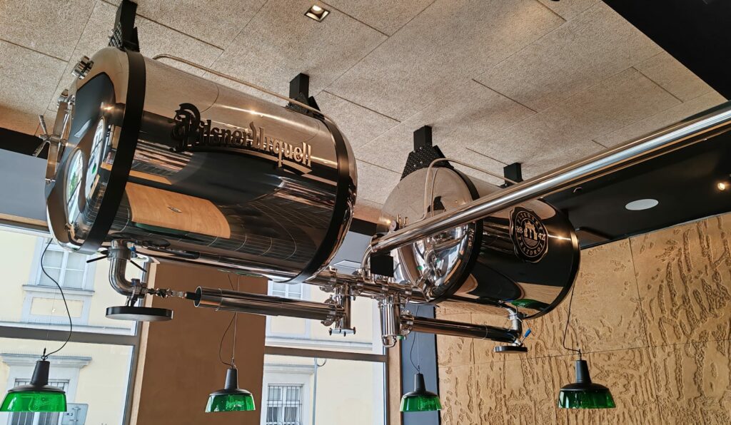 Pivná atmosféra z moderného interiéru priam sála. Hostí ihneď zaujmú napríklad obklady so vzormi sudov a kadí. Kľúčovým prvkom je však výčap z fúkaného skla obložený sklenenými kachľami z dielne sklárskych remeselníkov. K reštauráciám typu Plzeňky neodmysliteľne patria aj pivné tanky, tie sú v tomto prípade zavesené netradične na strop nad hlavy hostí.