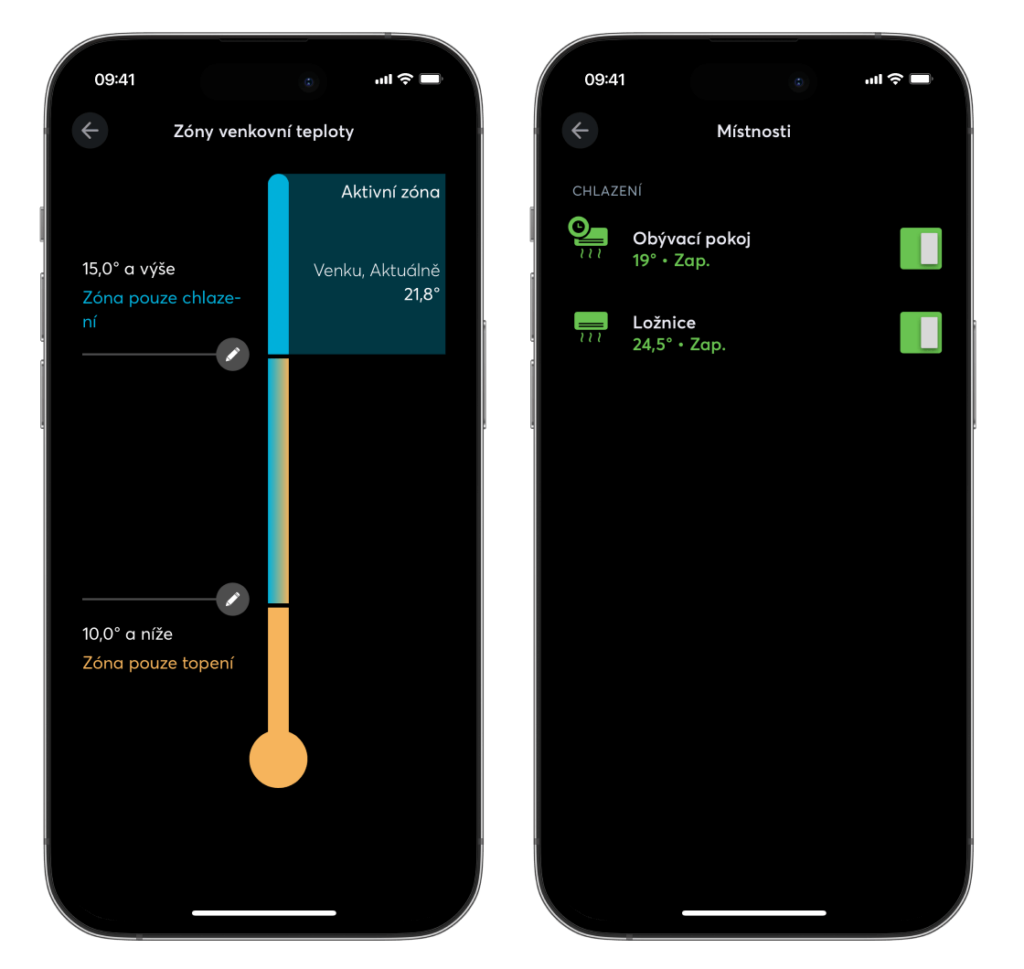 Pre väčšiu prehľadnosť sme Ovládanie klímy premenovali na Ovládanie vykurovania a chladenia. Aby sme užívateľom pomohli lepšie porozumieť správaniu Ovládanie vykurovania a chladenia a Ovládanie klimatizácií, upravili sme vizualizáciu v aplikácii.