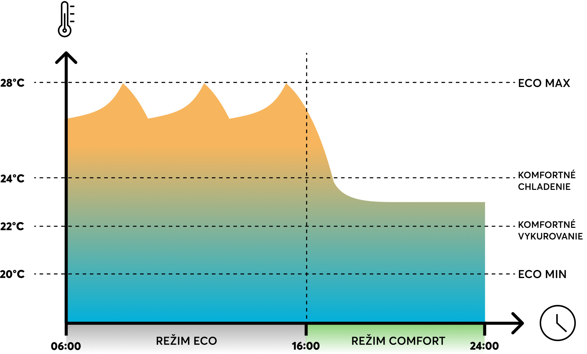 Aby bolo možné čo najefektívnejšie využívať lacnú energiu na chladenie alebo vykurovanie, je možné teraz miestnosť „podchladiť“ alebo „prekúriť“. Táto funkcia je vynikajúca napríklad v kombinácii s Energetickým managerom na optimalizáciu vlastnej spotreby fotovoltického systému alebo s Optimalizátorom spotových cien.