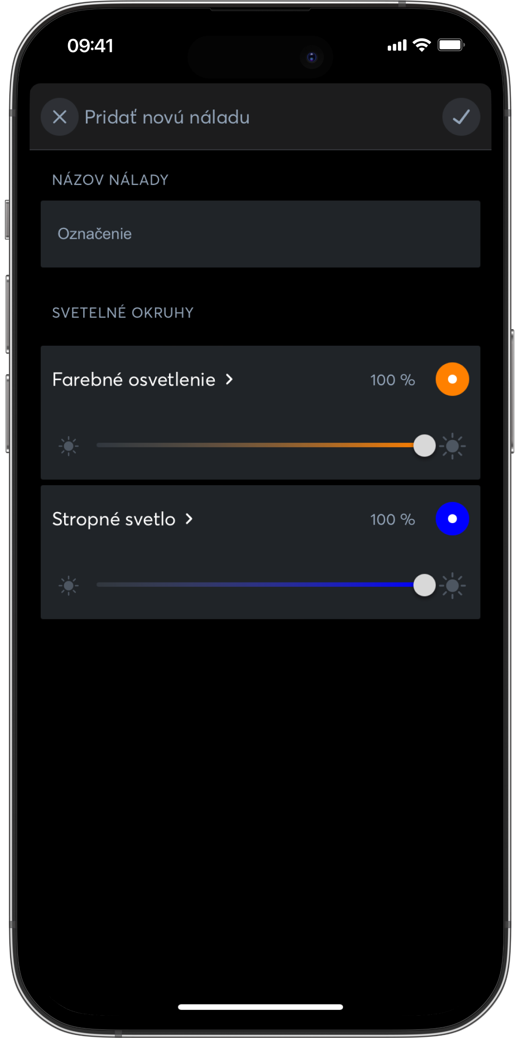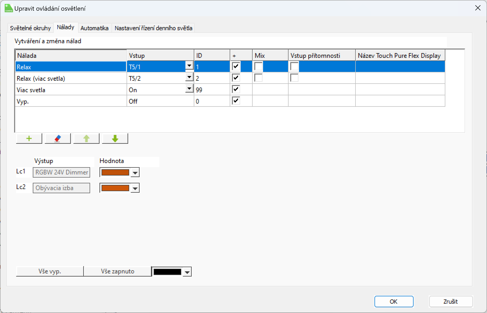 Prejdite v Configu na príslušnú miestnosť a blok „Ovládanie osvetlenia“ a zvoľte kartu „Nálady“. Vytvorte novú a definujte okruhy osvetlenia, farebnú schému a jas.