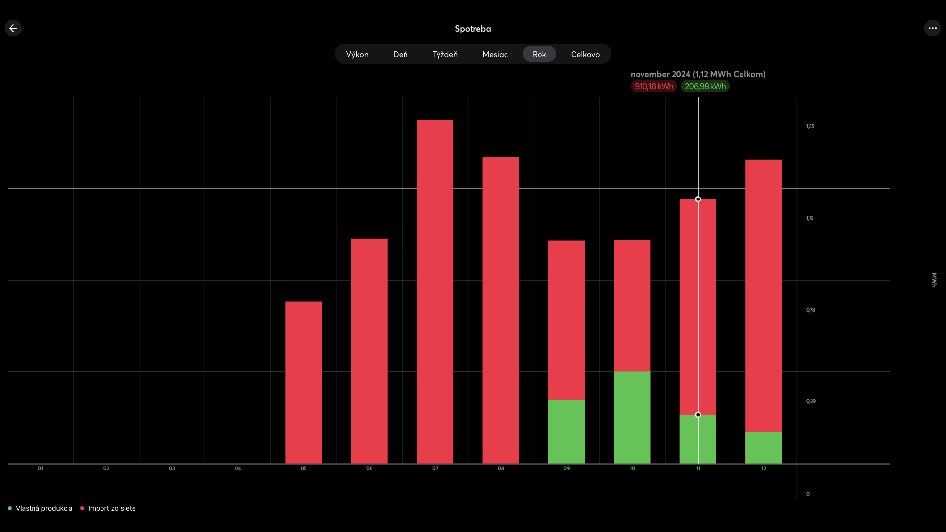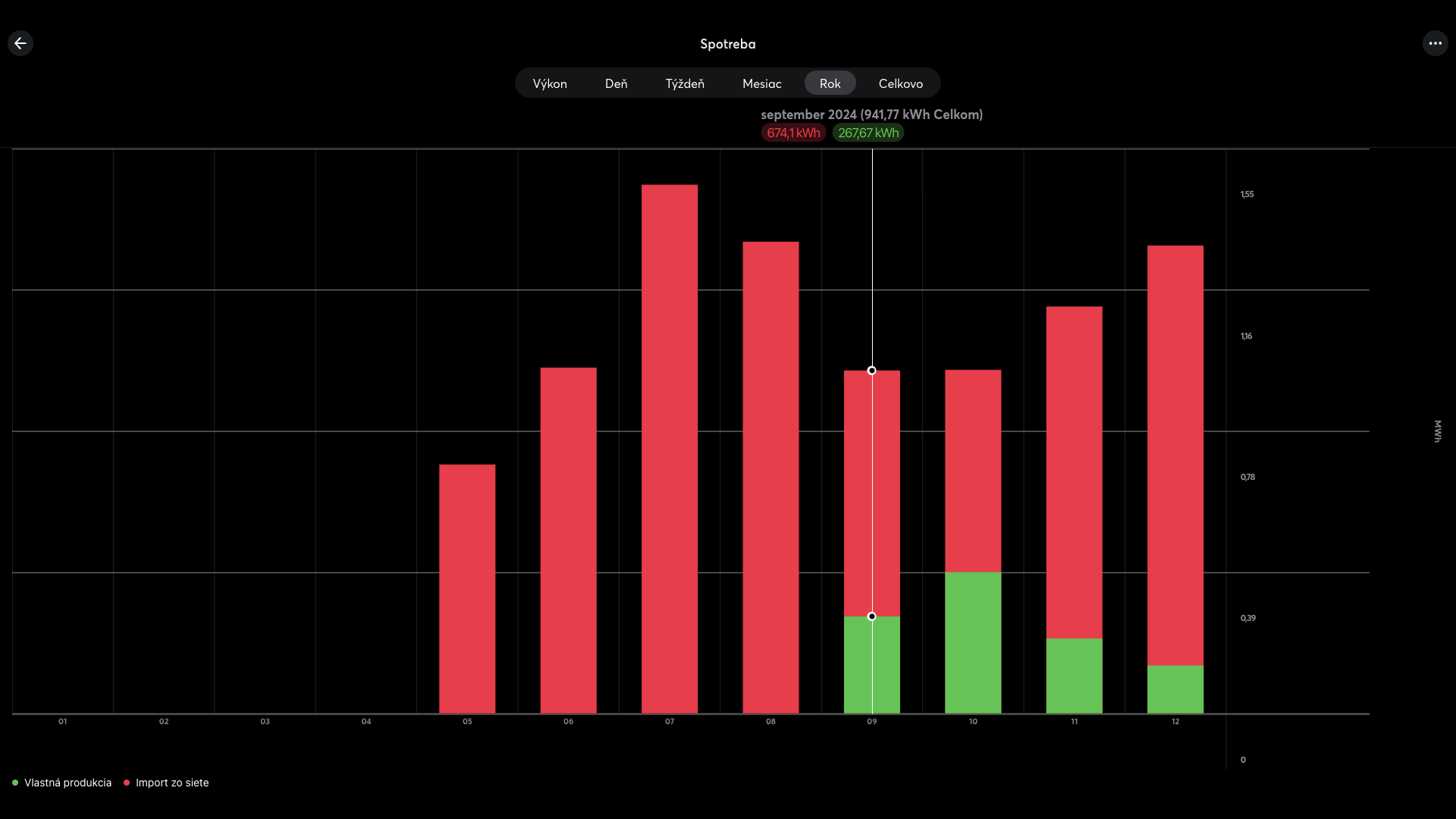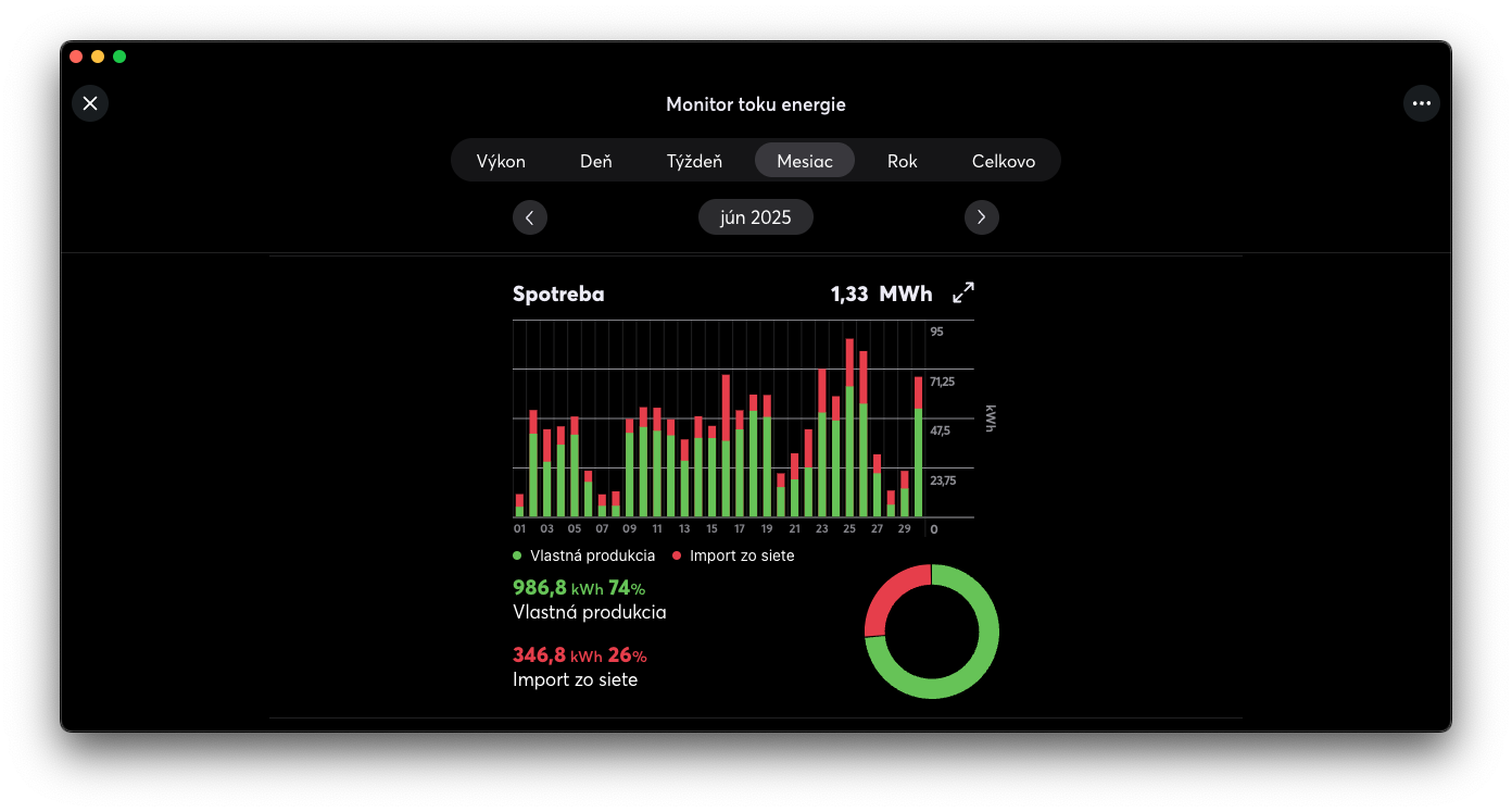 Pri porovnaní jesene 2024 s júnom 2025 je vidieť obrovský skok v sebestačnosti. Za celé obdobie od septembra do decembra 2024 vyrobila FVE spolu 996,78 kWh a ušetrila 274,11 €. Samotný jún 2025 pritom priniesol 986,8 kWh vlastnej produkcie (74 % spotreby) a úsporu 271,37 € – teda takmer rovnaký prínos ako štyri jesenné mesiace dohromady. Import zo siete v júni tvoril len 346,8 kWh (26 %), kým v roku 2024 dominoval dovoz. Graf vyššie tak pekne ukazuje, ako letná sezóna dramaticky zlepšuje výkon fotovoltiky a znižuje naše náklady. A to je pritom len jeden mesiac z letnej sezóny – v letných mesiacoch býva úspora výrazná a kumulatívne ešte citeľnejšia.