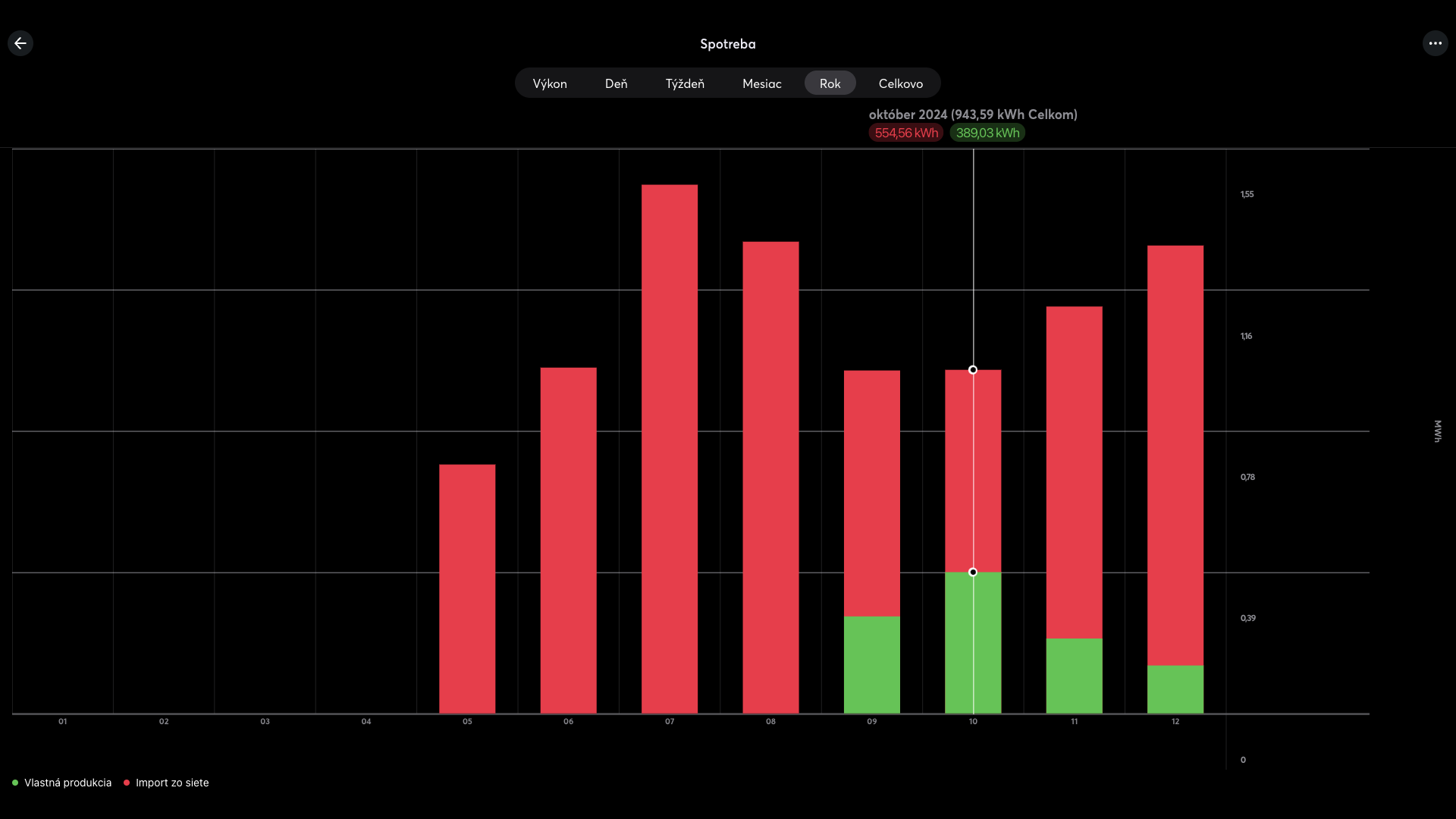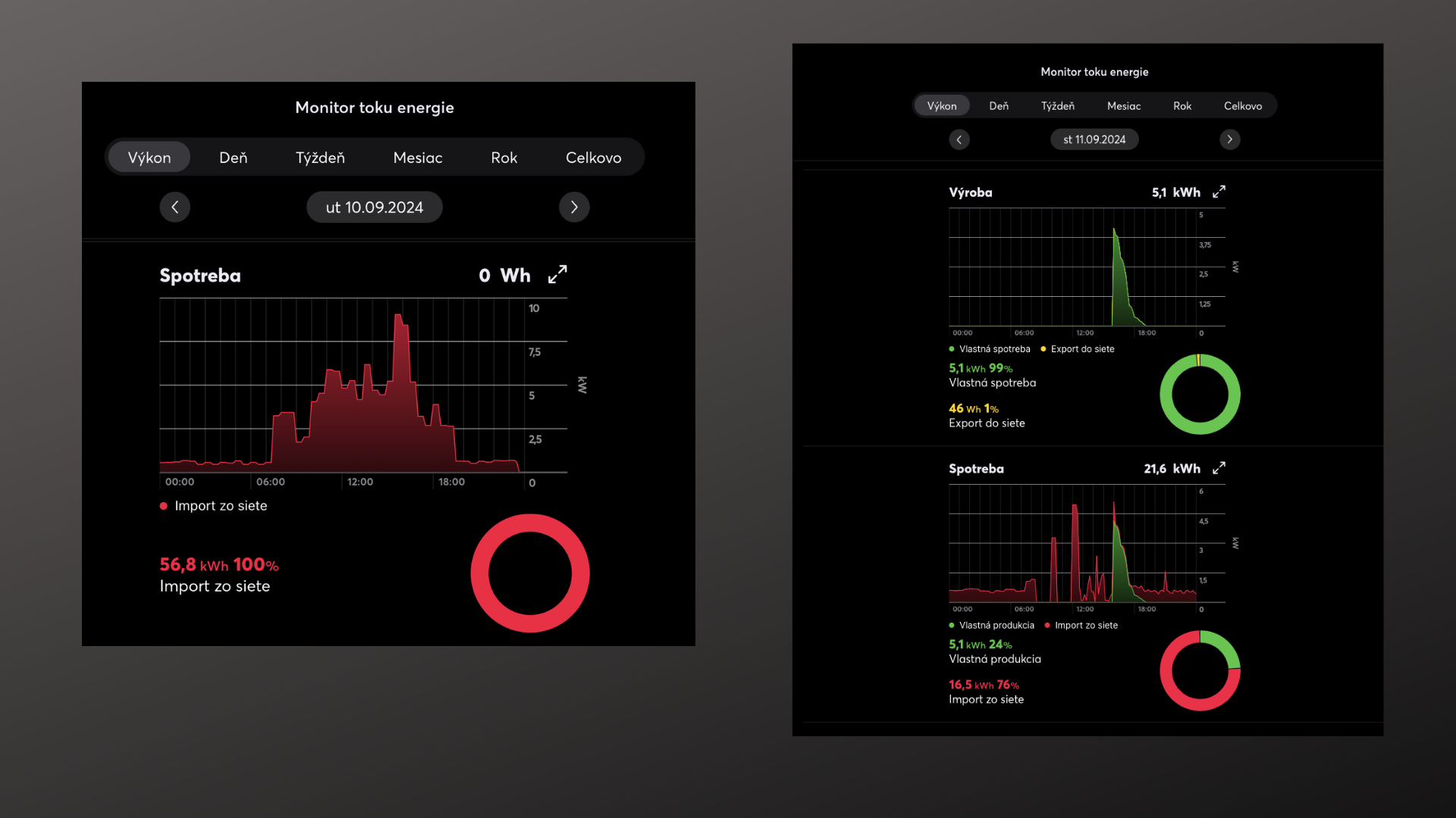 V grafe na ľavej strane chýba akýkoľvek zelený segment, ktorý by znázorňoval vlastnú produkciu, a celý donutový graf je vyplnený červenou farbou. To znamená, že v danom období neprebiehala žiadna výroba z obnoviteľných zdrojov a všetka spotreba bola spojená s vyššími nákladmi aj uhlíkovou stopou. FVE sme nasadili už nasledujúci deň, 11. 9. 2024, čím sme začali postupne znižovať závislosť na dodávkach zo siete, čo jasne znázorňuje graf na pravej strane.