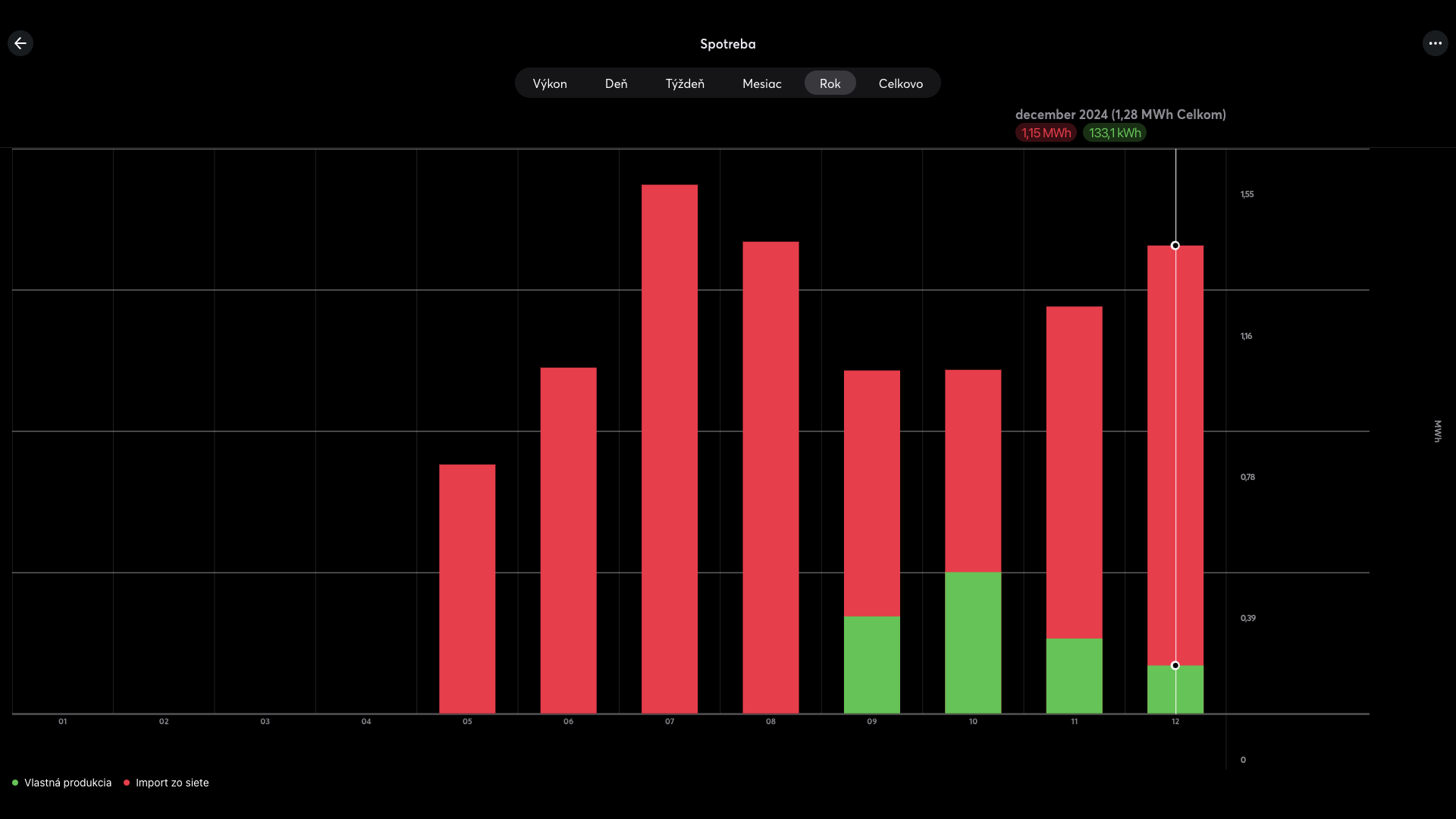 Od spustenia fotovoltiky v septembri 2024 dosiahla slovenská pobočka citeľné úspory na elektrine. Podľa meraní a grafov v aplikácii Loxone vyrobila FVE do konca roka 2024 spolu 996,78 kWh vlastnej energie (267,67 kWh v septembri, 389,03 kWh v októbri, 206,98 kWh v novembri a 133,10 kWh v decembri). Pri cene 0,275 € za kWh to predstavuje finančnú úsporu 274,11 €, ktoré by sme inak zaplatili za odber zo siete.