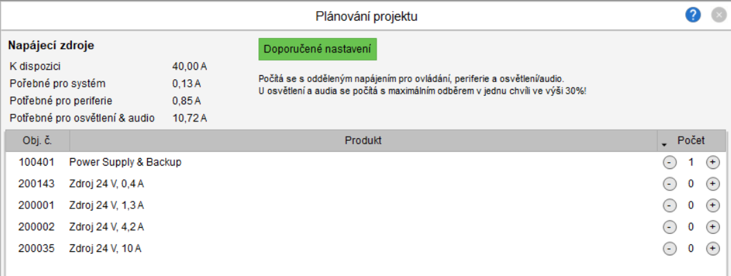 Nástroj Plánovanie projektu v Loxone Configu vypočíta potrebný výkon úplne automaticky na základe plánovaných komponentov.