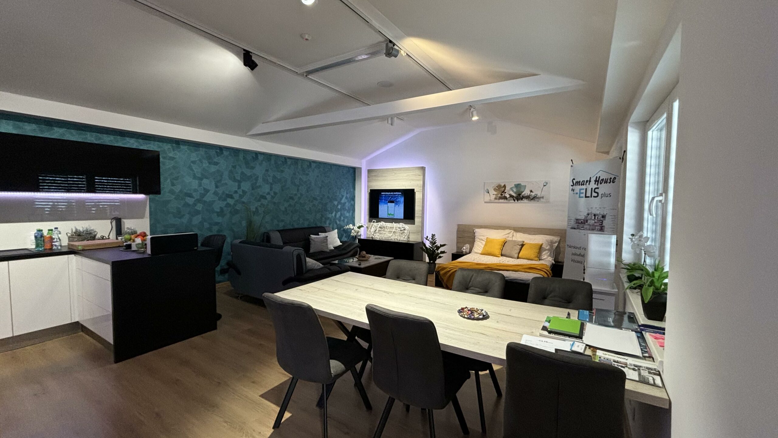 Náš showroom spája príjemné s praktickým, nachádzajú sa v ňom klasické miestnosti ako spálňa, kuchyňa, obývačka, záchod a chodba. Showroom ponúka ukážku osvetlenia so zaujímavými scénami, rôzne tipy kúrenia či chladenia v čase prítomnosti alebo neprítomnosti. Tiež môžete vidieť zaujímavé ovládanie žalúzii, ktoré pracujú na základe rôznych podnetoch. Taktiež sa môžete tešiť na ukážku audia a celkovej funkčnosti keď človek príde dnu a systém zapne svetlá a televíziu a teplota už predtým bude pripravená na požadovanú alebo komfortnú.