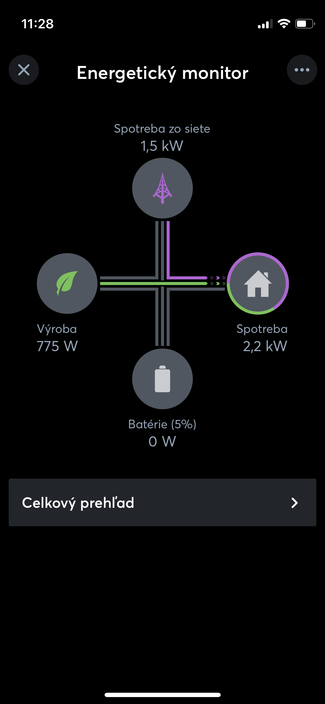 Nielen pre majiteľov fotovoltaického systému. Na prvý pohľad vidíte, koľko energie spotrebujete v dome, koľko FV systém produkuje, koľko toho získate alebo privádzate zo siete či koľko je uložené. Štatistiky sú zahrnuté!