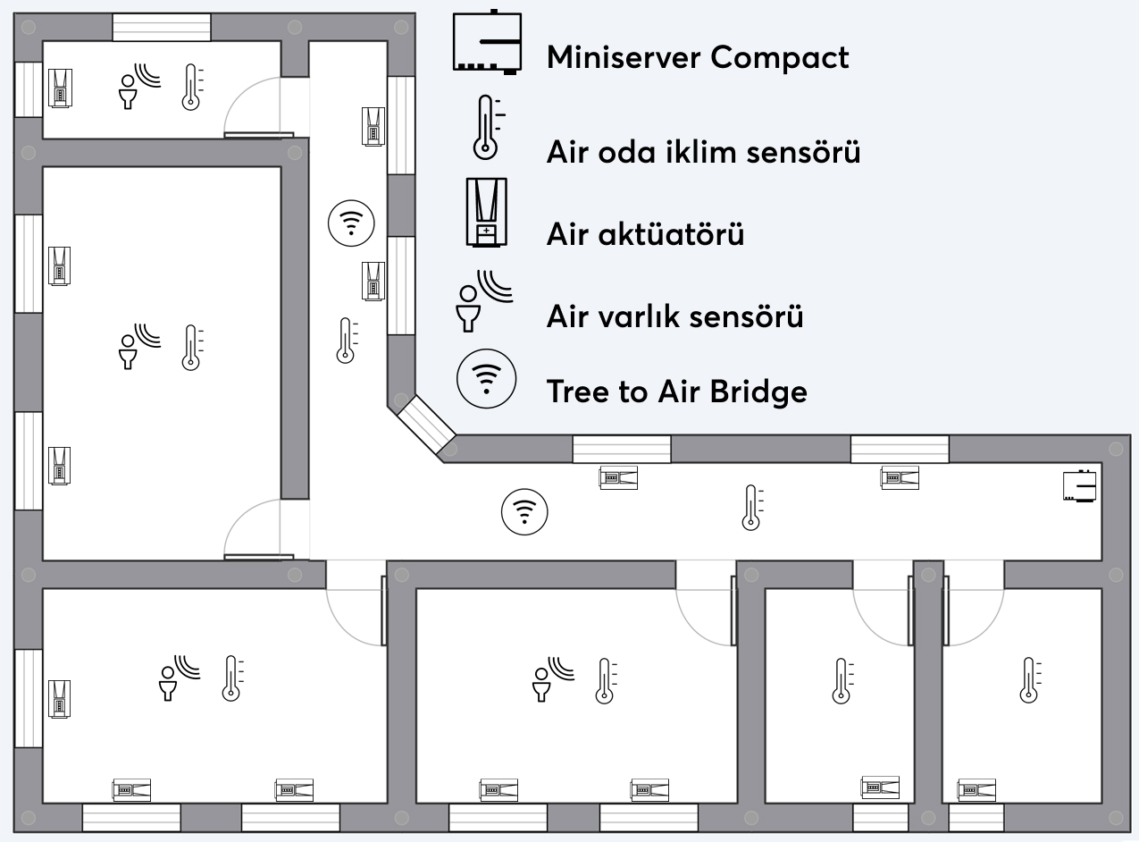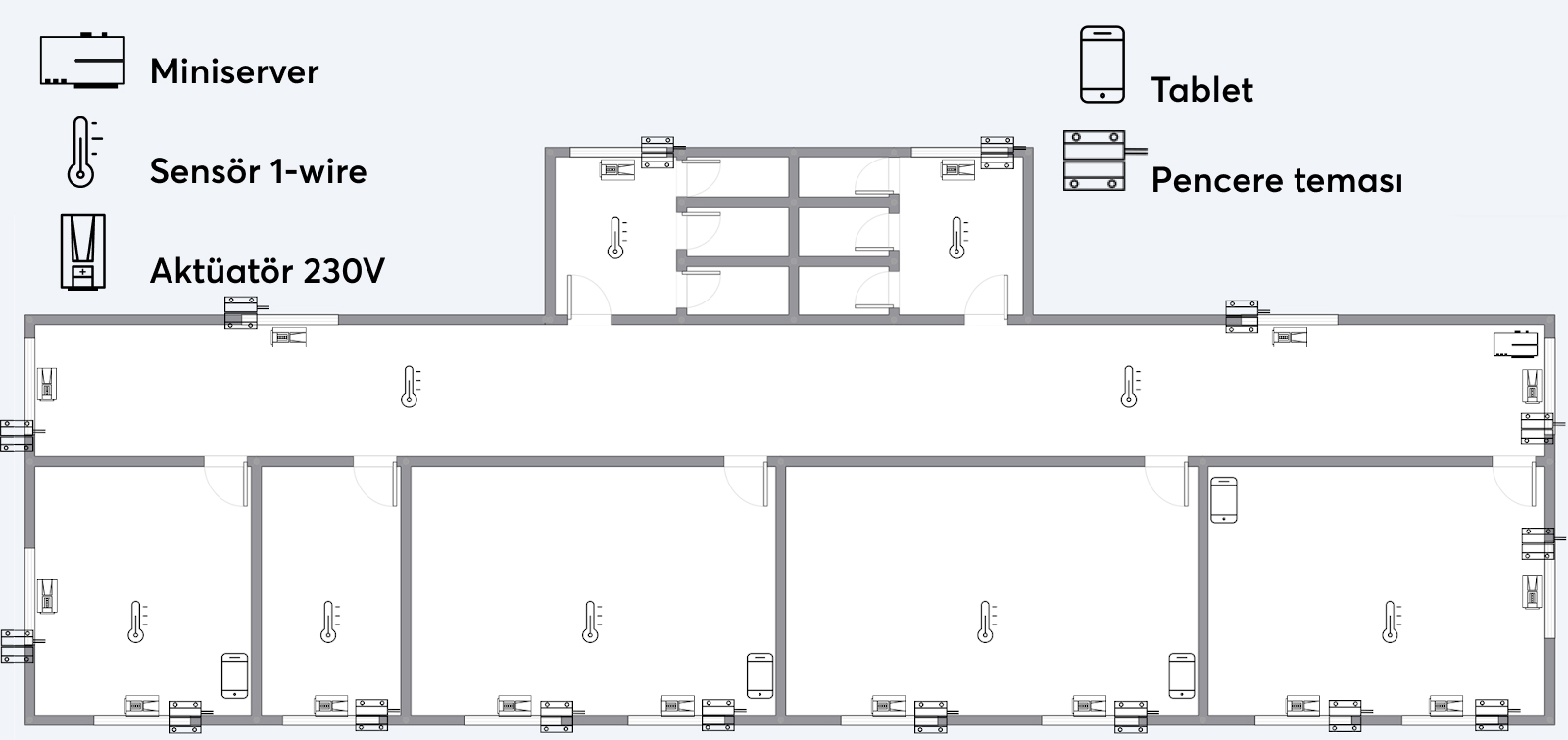 Miniserver, ısıtma başlıklarını kontrol eder ve sıcaklığı ölçmek için düğmenin altına gizlenmiş 1 telli bir sensör kullanır. Pencerelere manyetik kontaklar ekleyerek odanın havalandırıldığı bilgisini alıyoruz ve belirli bir süre sonra ısıtma otomatik olarak kapatılabiliyor.